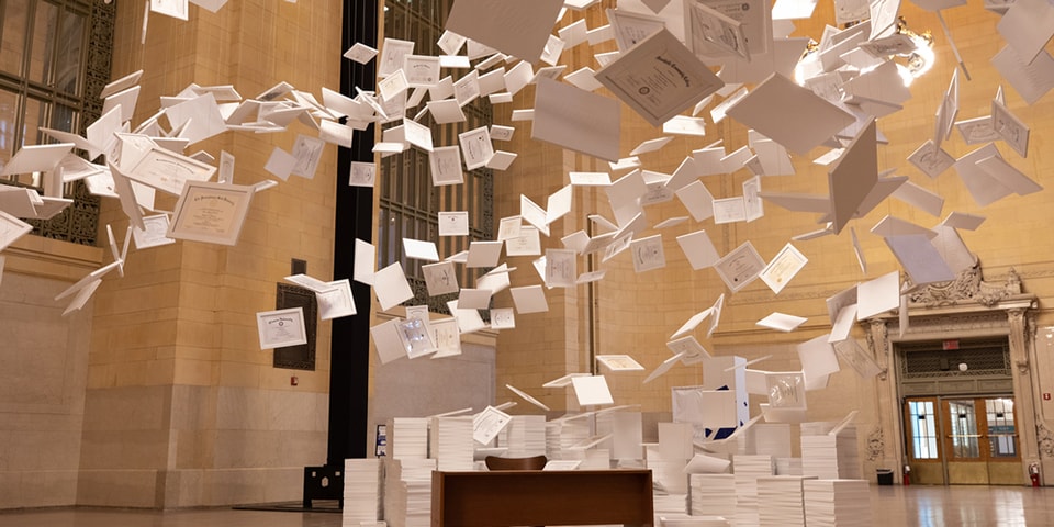 The artwork is a cascading installation of 2,600 real college diplomas, which are roughly valued at a little over $180,000 each — the average cost of four-year college education in the U.S. This has made the installation valued at $470 million USD, just $20 million USD over the most expensive painting ever sold: Leonardo Da Vinci’s 600-year-old Salvator Mundi.