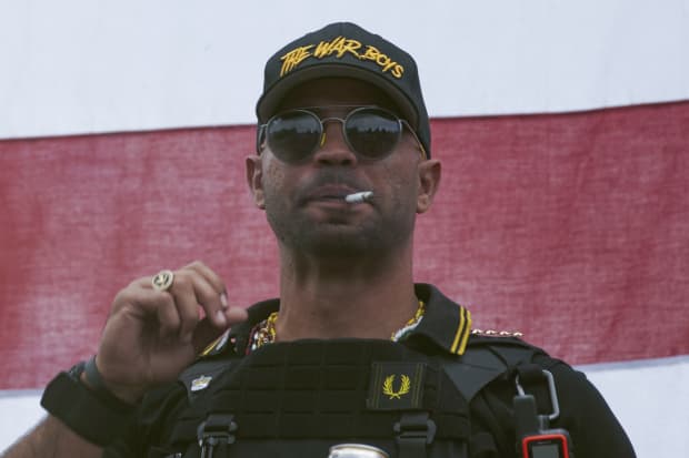 Proud Boys leader Henry "Enrique" Tarrio appears at a rally in Portland, Ore., last year.