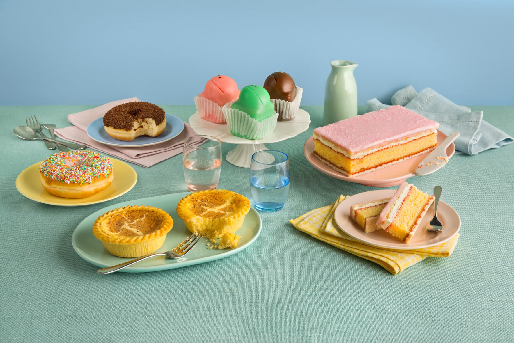Balfours is best known for its pastries including its pasties, footy pies and other patisserie — especially its frog cakes, which consist of sponge cake, jam and cream covered in a layer of coloured fondant icing in the shape of a frog's head.